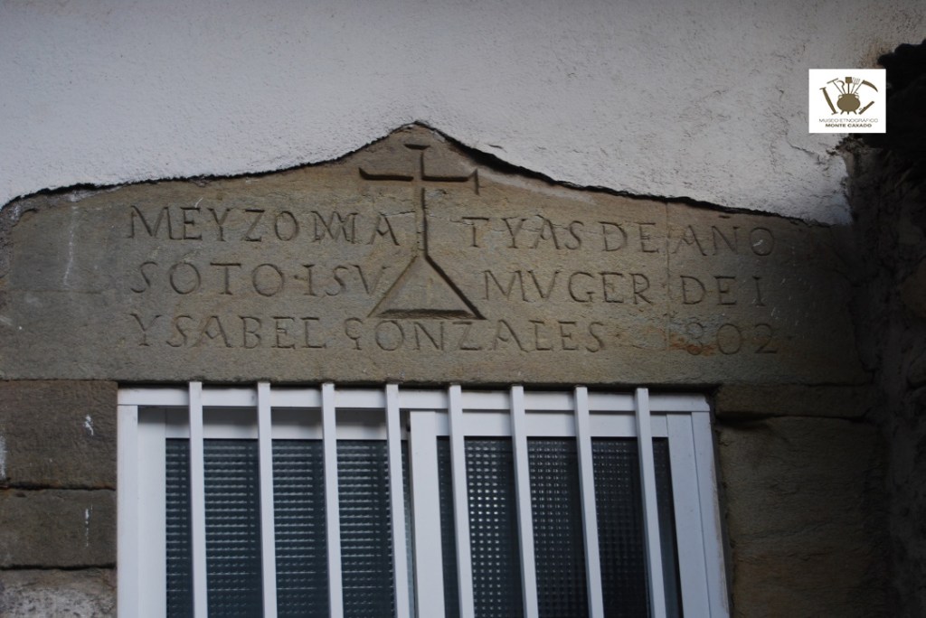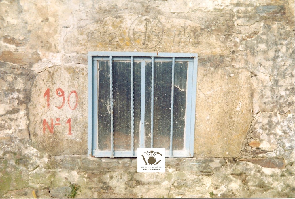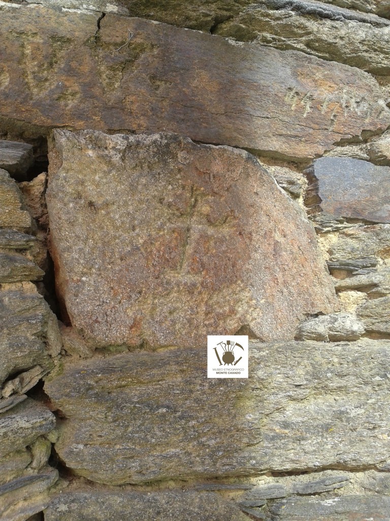 Esta cruz coa inscrición está situada no que noutrora fora o lintel da porta da entrada e hoxe é o dunha fiestra, no que parece ser unha pedra de toelo ou pedra de serpentina.