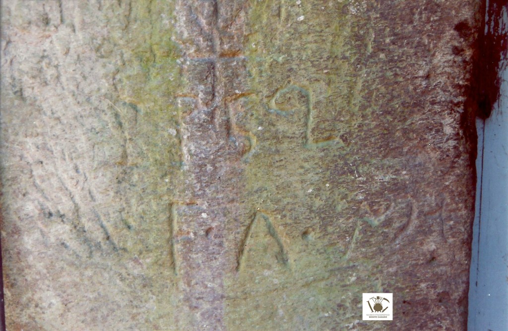 De destacar son dous aspectos: Primeiramente a cruz riscada, pois enriba dela leva tres raíñas, unha como prolongación do brazo pequeno e outras dúas do mesmo tamaño á anterior e oblícuas a ela. Segundo, dous signos semellantes a unhas PP seguidos de 5 e 2. Pola miña parte tratei de identificar estes signos con números sen logralo; o que está máis preto do 5 puidera ser un nove trocado de lado, é dicir, mirando para a dereita. Mais o primeiro non pecha como unha P ou un ), senón que está aberto a xeito dun mango de bastón e na súa parte baixa, ao remate da raía vertical, ten unha horizontal (-) ben pronunciada.