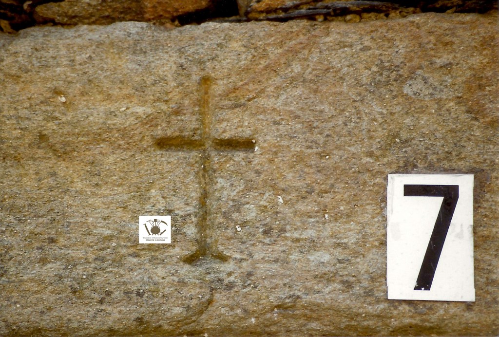É unha pequena cruz riscada na parte onde comeza, aproximadamente, o brazo vertical inferior de dito cruceiro.