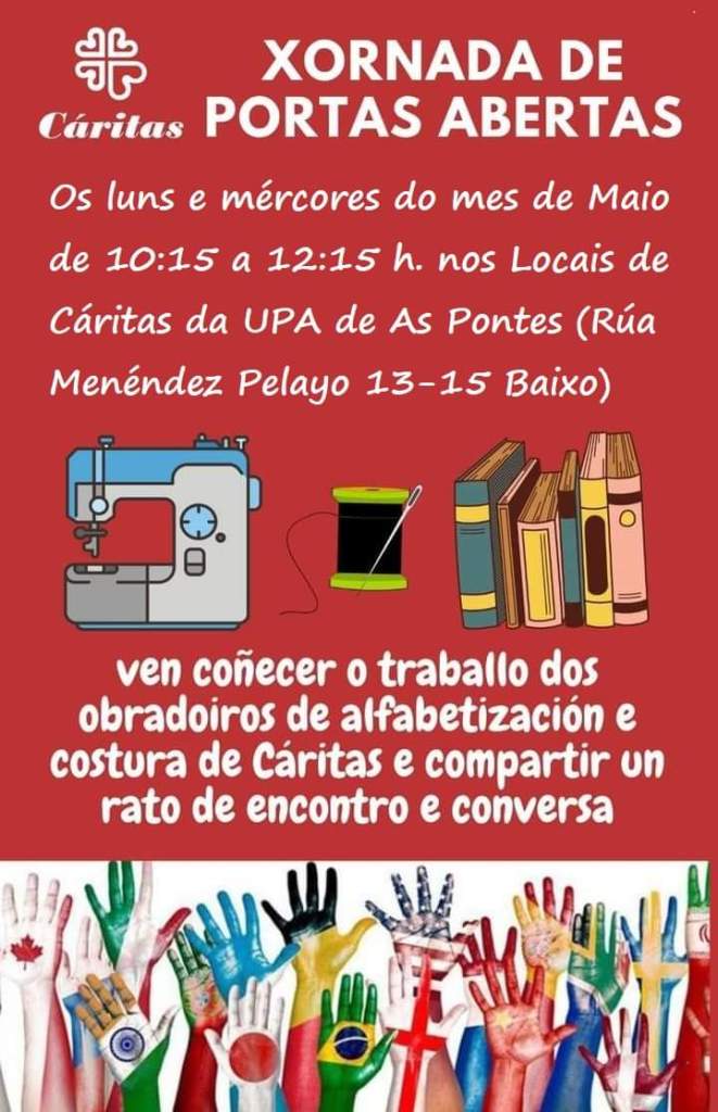 Dende Cáritas da Unidade Pastoral das Pontes, queremos invitar a todas as persoas que o desexen a acudir os luns e mércores do mes de Maio de 10:15 a 12:15h as xornadas de portas abertas, e coñecer de primeira man os programas que desenvolvemos dende Cáritas.