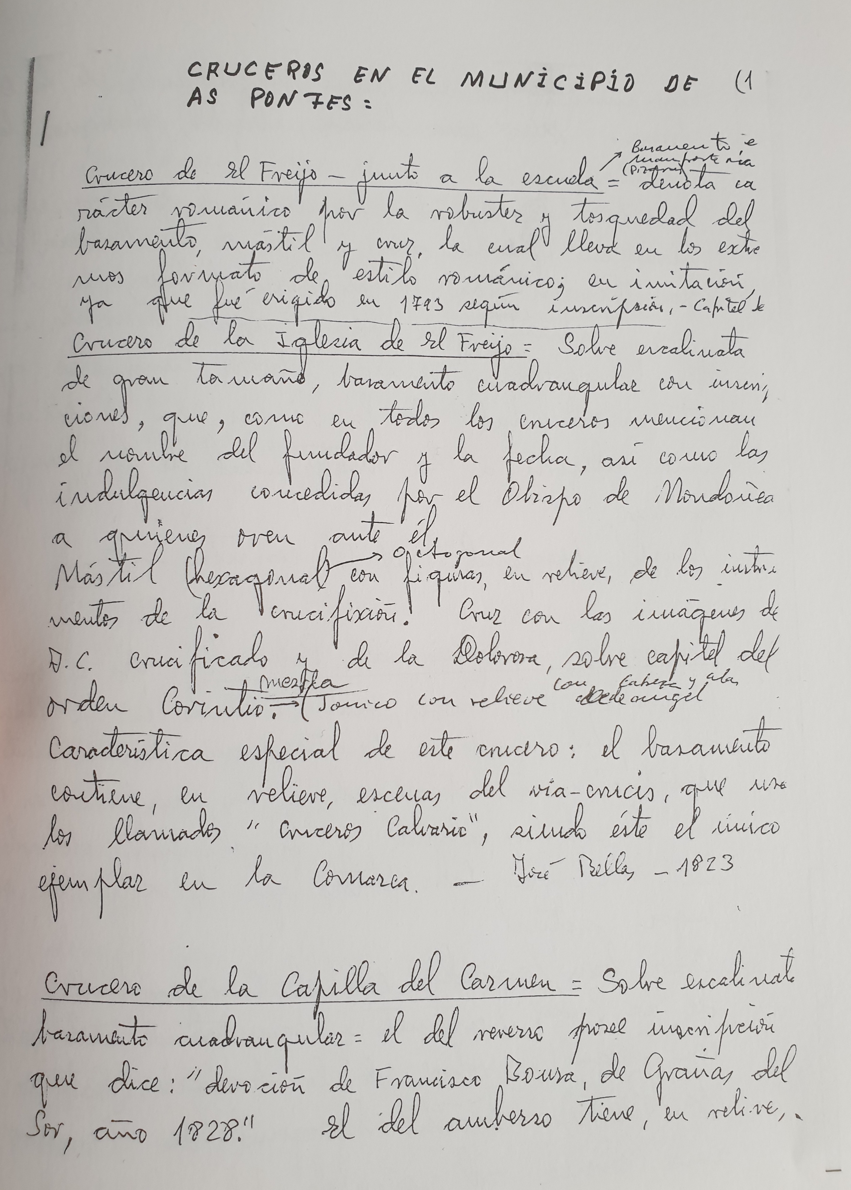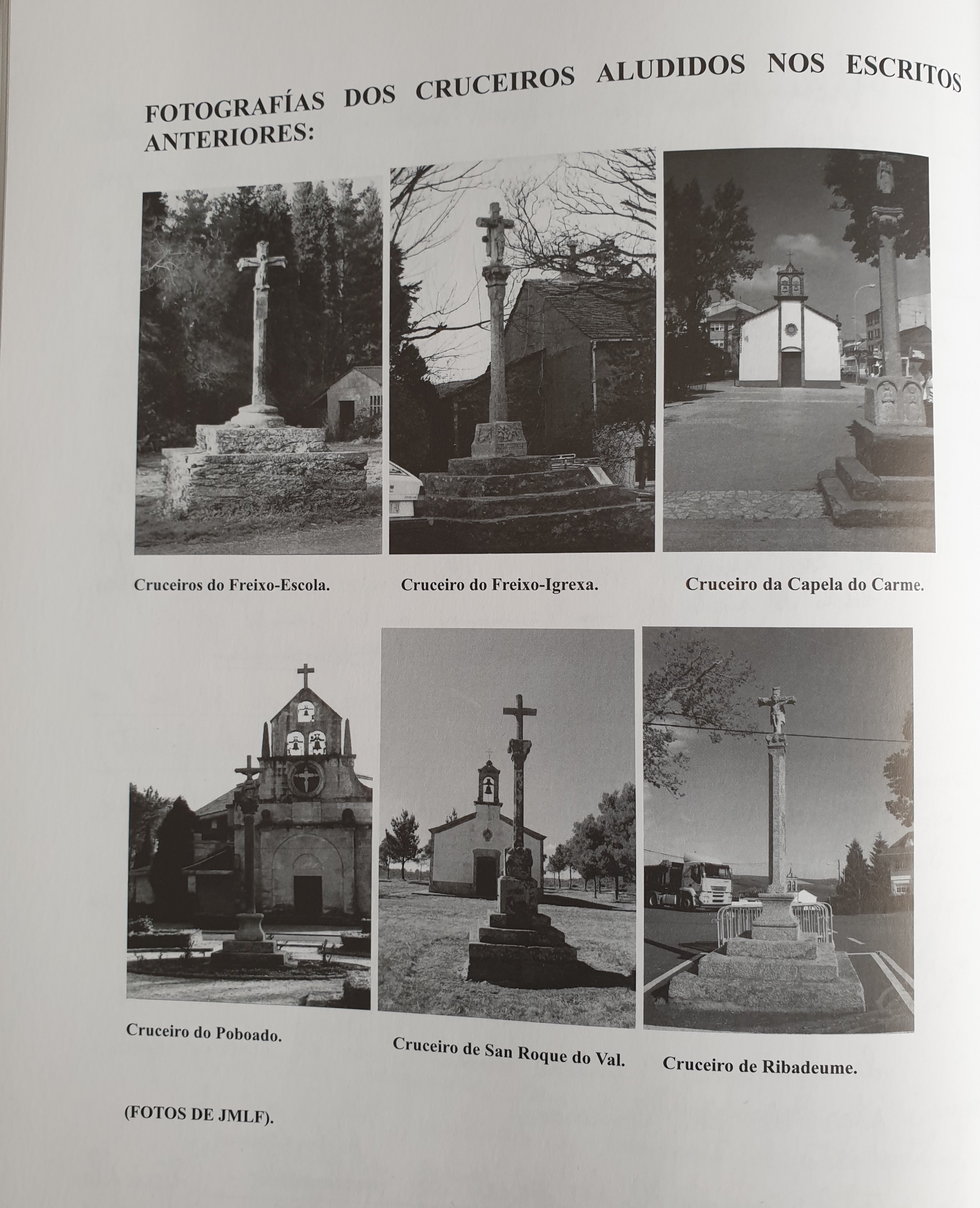 Imos falar logo das cruces e comezamos cos cruceiros, temos arredor duns 40 entre cruceiros completos e incompletos. E aclaro esta clasificación persoal que fago: Todos os cruceiros non son iguais nas súas partes, algúns carecen de partes que outros teñen. Para min, cruceiro completo é o que ten as seguintes partes: plataforma, pedestal, varal ou fuste, capitel, cruz anverso (Cristo) e reverso (Virxe). De faltar algunha destas partes, sería un cruceiro incompleto e metendo dentro destes os chamados Cristos ou cruces altas, xa que levan, ás veces, gradas (unha ou dúas) e outras un pedestal.