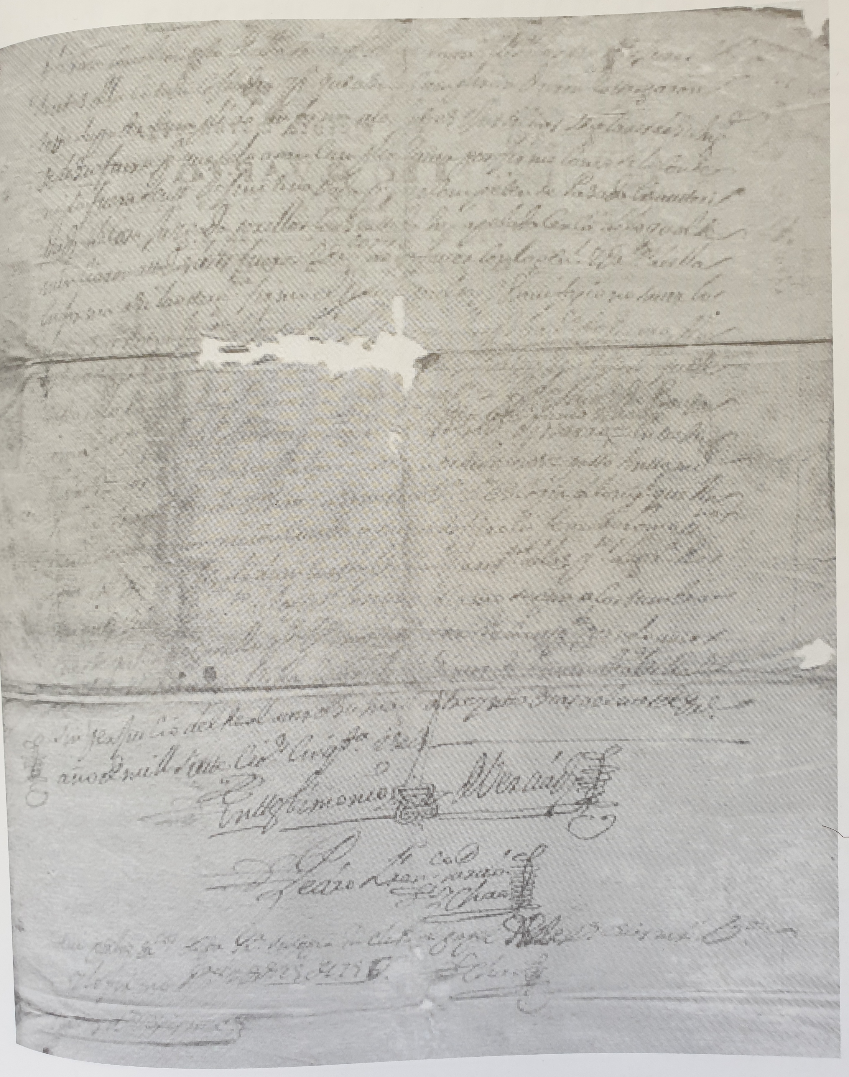 Anotaciones al texto dejadas por Don Enrique: – Acta notarial dirigida a la Condesa de Lemos en protesta por los abusos de los Exactores del tributo de “Alcabalas” que antes si vendían bienes raíces de los Colonos. – El documento informa a la Condesa de una decisión del Pueblo de Puentes, representado por su Párroco, Mayordomos de la Parroquia y Testigos comparecientes: 1) – Acuerdan que los Vendedores coticen el pago correspondiente a los bienes enajenados. 2) – Se conceden atribuciones a los Mayordomos para efectuar esos cobros, expedir recibos y defender esta postura ante los Tribunales.
